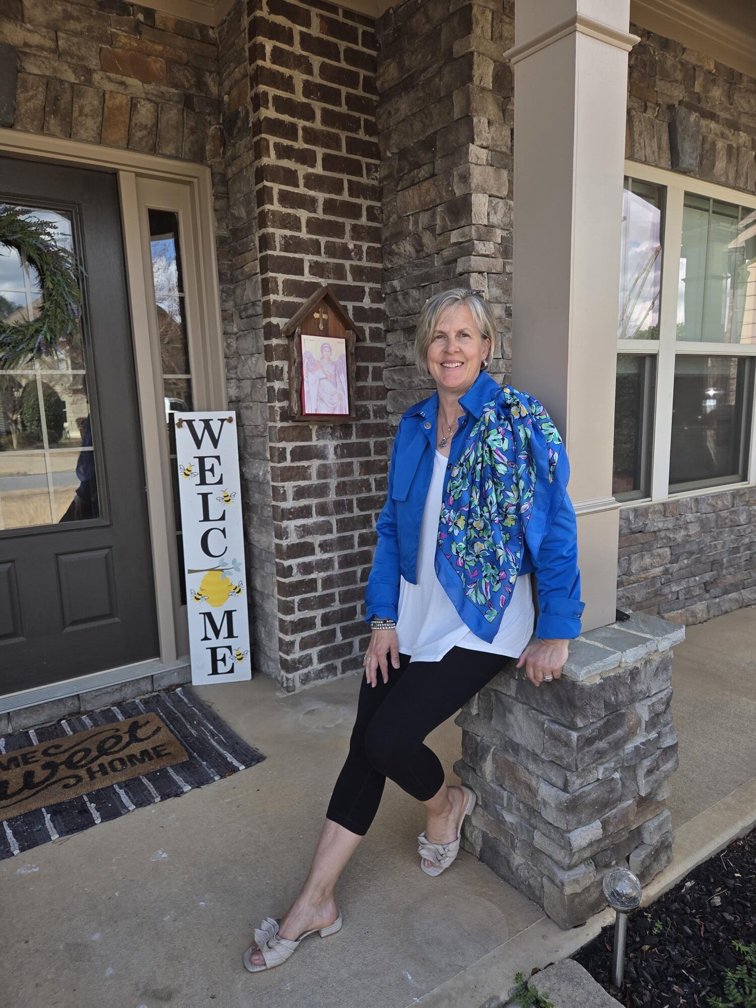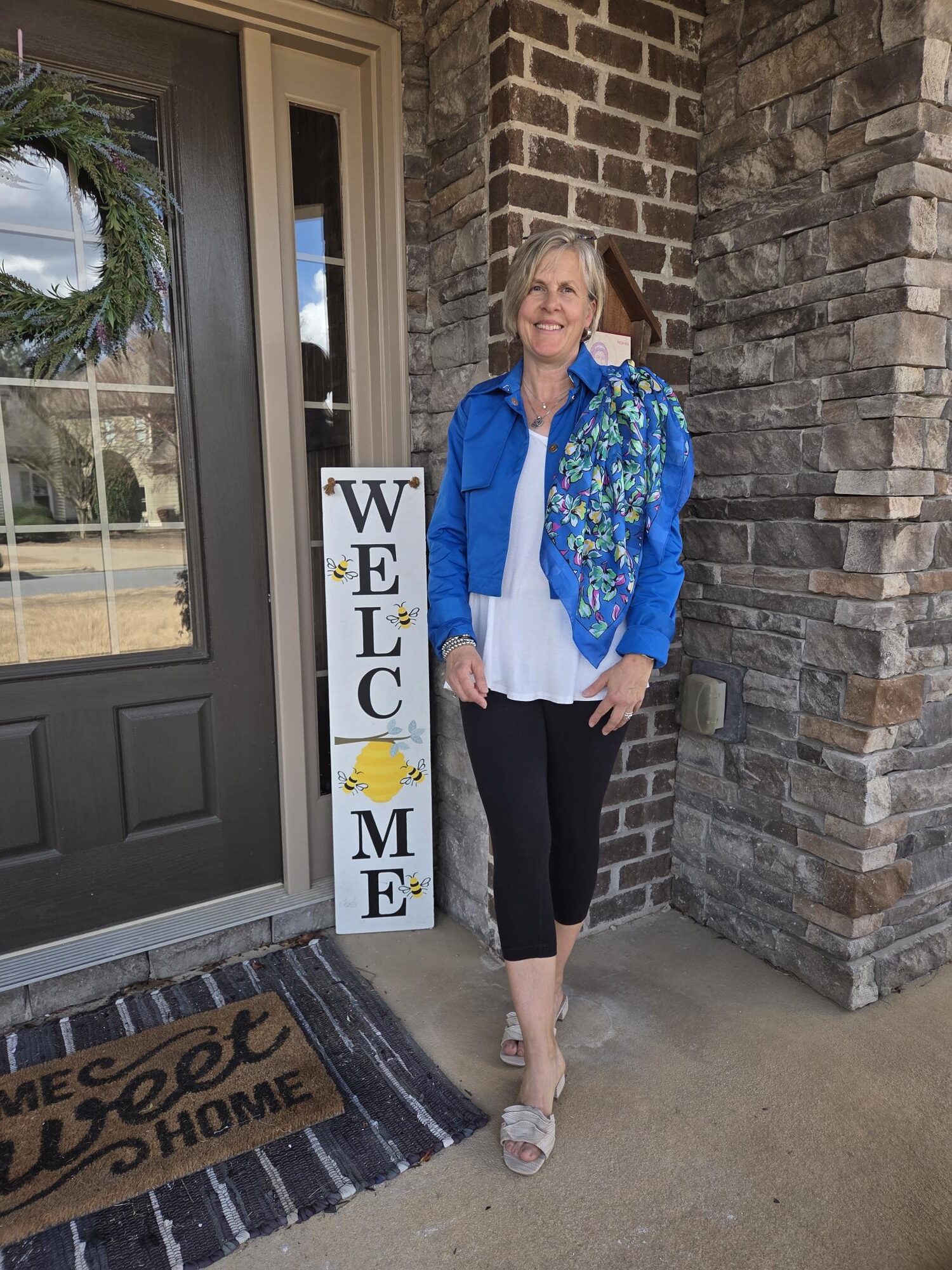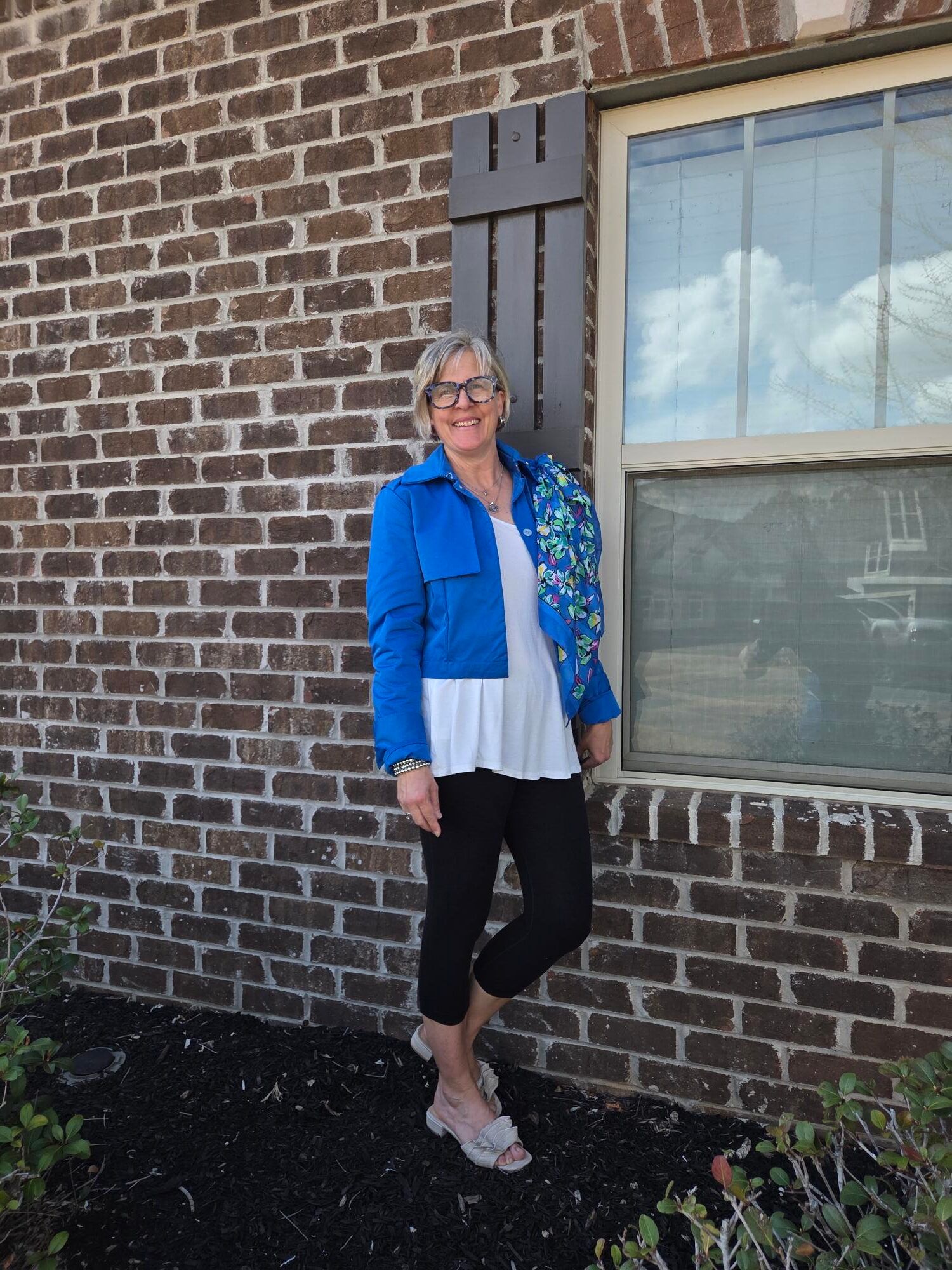 My fun blue readers were a fun addition: I have several pairs of readers and I mostly alternate between a burgundy pair and this one. I am on the lookout for another fun pair. I haven’t worn my “new” sandals yet this year. I had my sons buy them for me at Christmas when I saw them on clearance. They are really cute! Do you own a pair of cropped leggings? You might have a pair that you work out in: see if you can come up with an outfit with them!