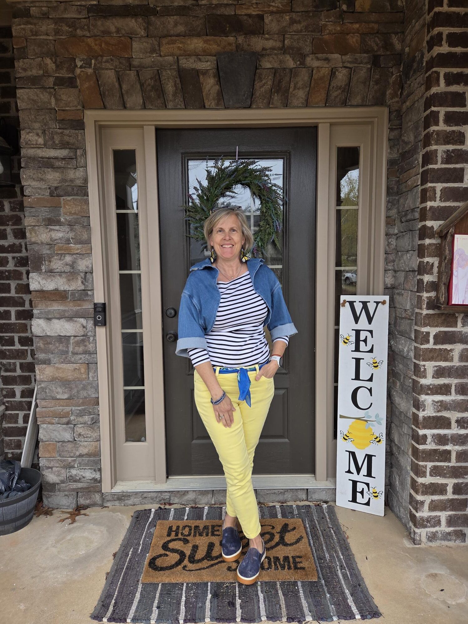 This is an older denim jacket in a classic fit I got from Target some years ago. I do have several denim jackets in different colors from white to yellow and different shades of denim. They all are here to stay in my closet as they never go out of style. Some years, I wear them more than other years and quite often they are worn in spring over a dress. I had fun with this outfit and the different stripes: it has been fun to add scarves to my outfits on cool spring days and I am practicing different ways to tie them.