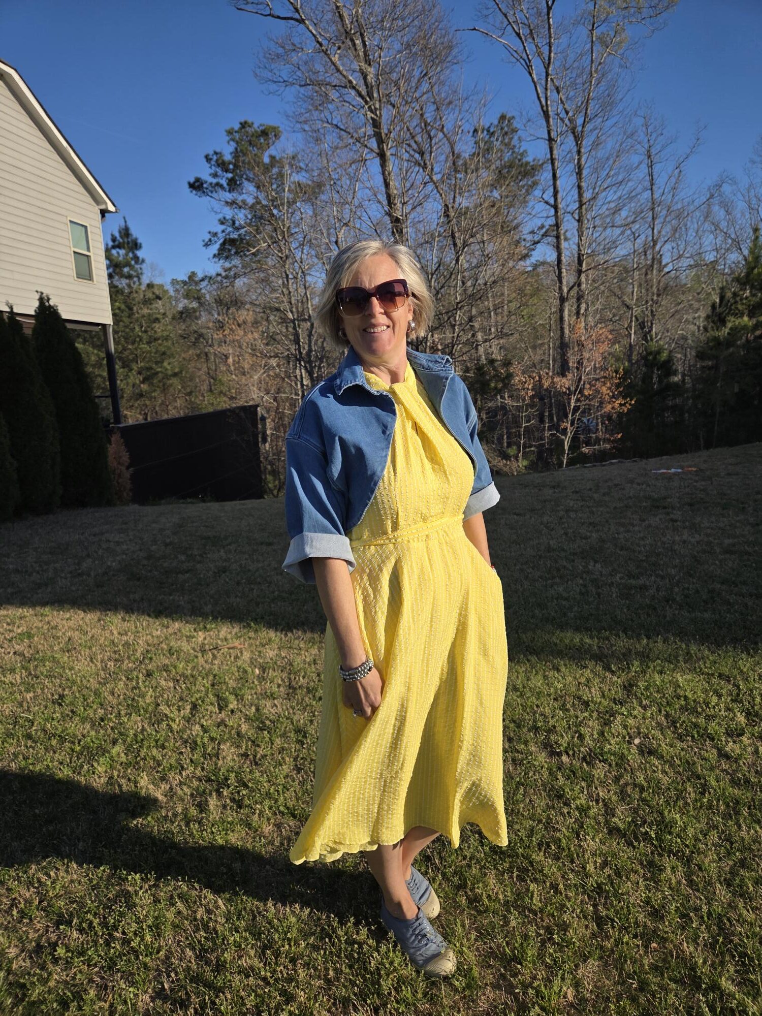 When I thrifted this little denim shrug, it had long sleeves which were quite long. After debating for a day or two, I decided that I would wear it more if it had short sleeves, so I cut them. The first look was a fun outfit to wear despite it being a little cold for it. I like the idea of a denim shrug because it is lighter than a full jacket, but still provides coverage (think sleeveless tops and dresses) and interest. I wore it again with yellow a couple weeks later for church since it is a halter dress and I cover up in church.