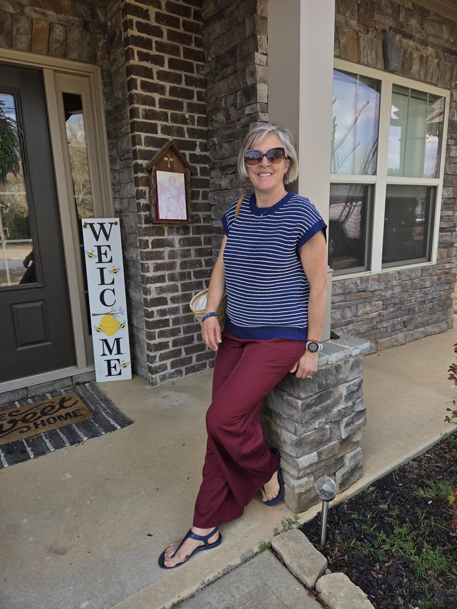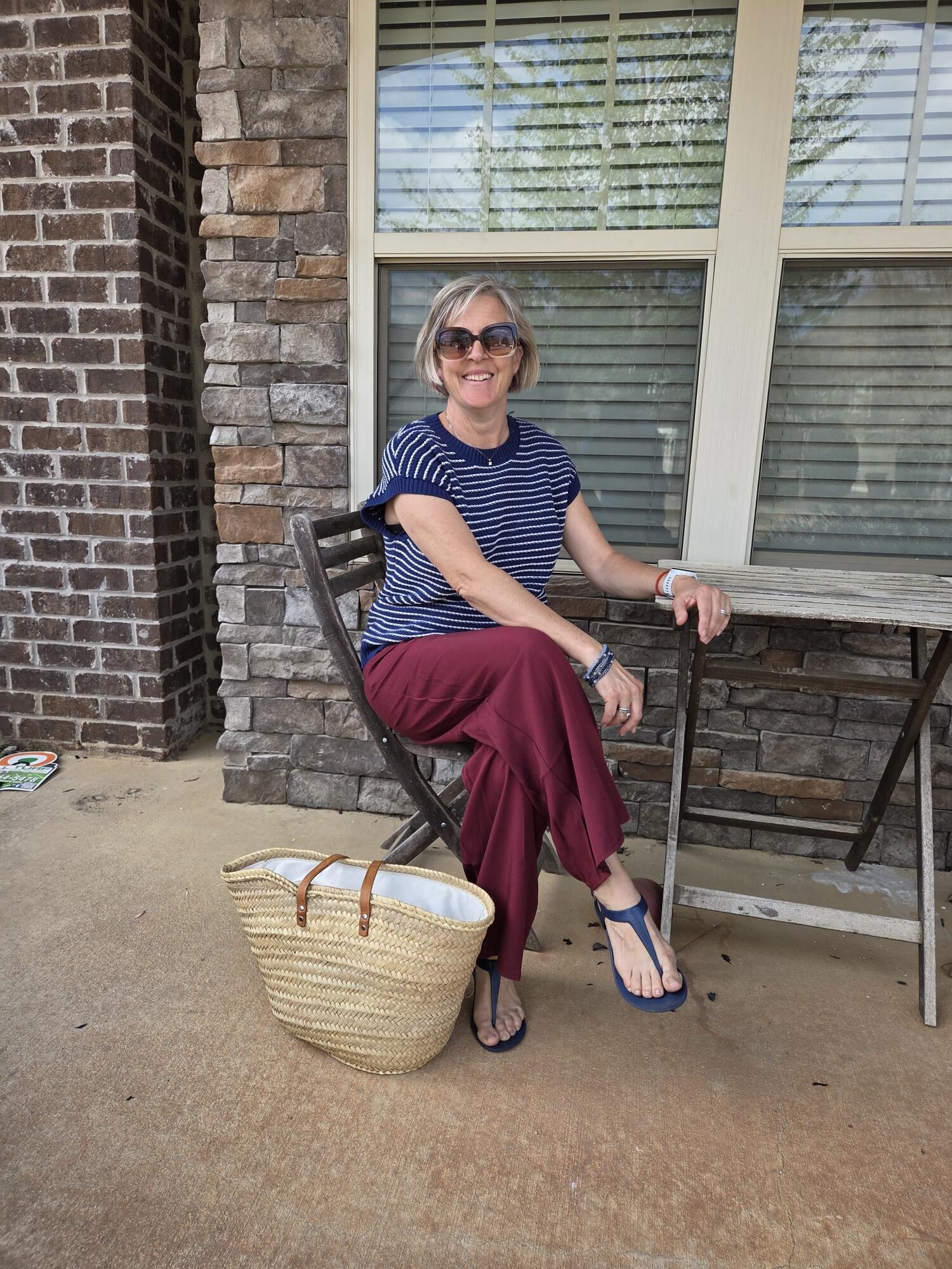 I follow Melodie Banfield on Instagram: she is a beautiful, classy French young women who shares her photo shoots in Paris where she lives with her husband. She also spends some time in the countryside and is a delight to follow. Recently, she shared an outfit with a pair of burgundy pants and a short sleeve striped navy sweater in a photo shoot at a market in Paris. As soon as I saw it, I knew I could wear a similar outfit. Here is her IG and if you go back a little, you can see the inspiration picture.